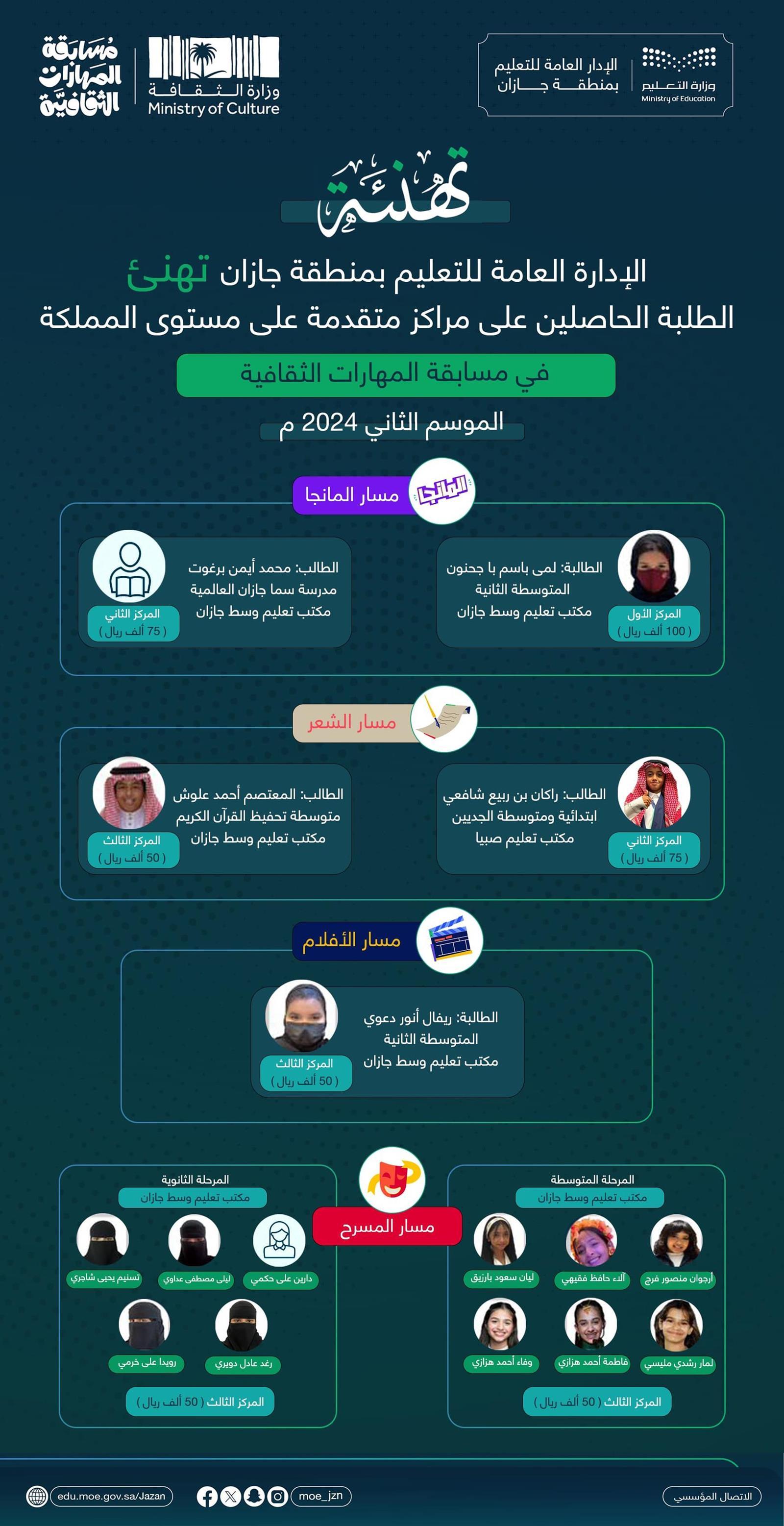 رد: 16 طالبًا وطالبة من تعليم جازان يحققون مراكز متقدمة على مستوى المملكة في مسابقة المهارات الثقافية🍀