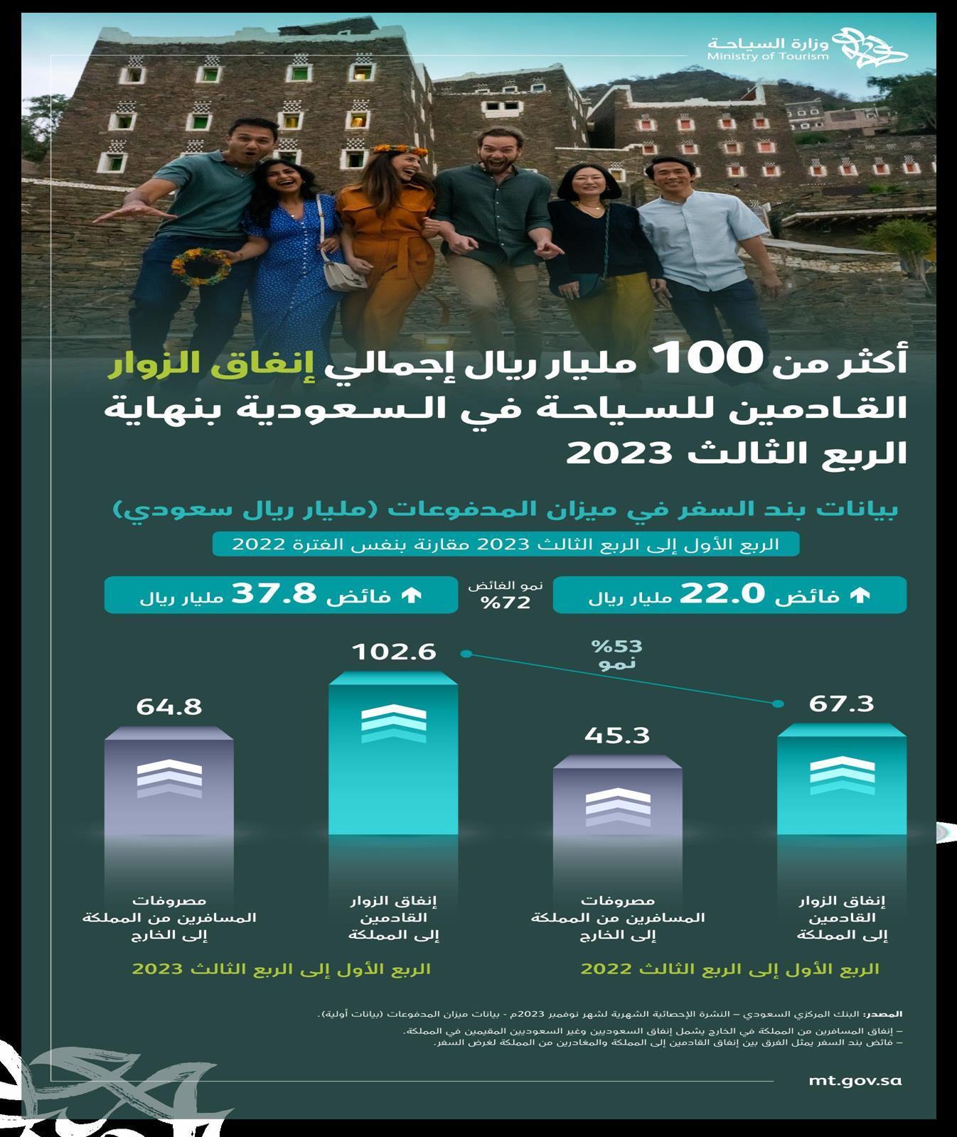 رد: بنسبة نمو بلغت 72% مقارنة بـ 2022م.. السياحة تعلن تجاوز حجم إنفاق زوار المملكة الـ 100 مليار ريال خلال الأرباع الثلاثة الأولى من عام 2023م