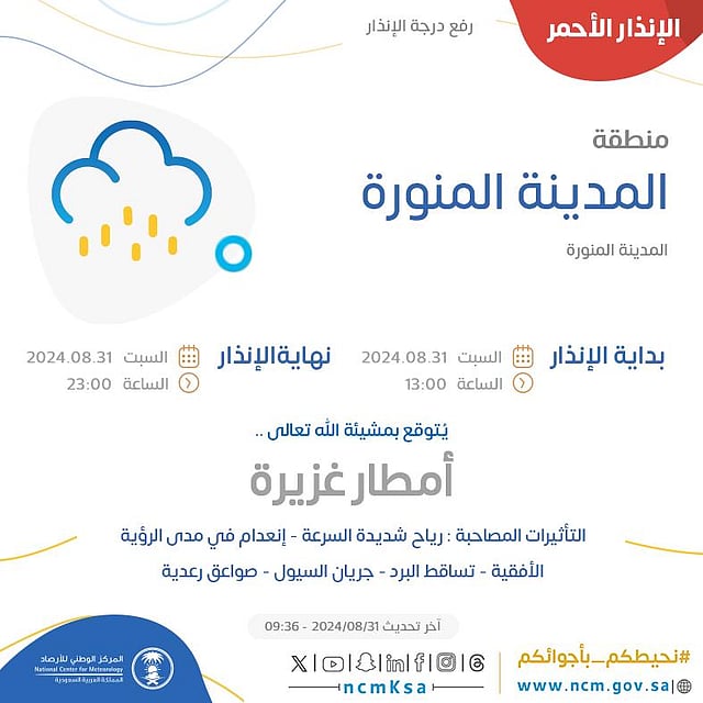 في حالة تستمر لـ 11 مساءً مصحوبة بانعدامٍ في مدى الرؤية الأفقية سبق تم النشر في: 31 أغسطس 2024, 10:29 صباحاً أصدر المركز الوطني للأرصاد، تنبيهاً باللون الأحمر لمنطقة المدينة المنوّرة؛ متوقعاً هطول أمطارٍ غزيرة. وقال المركز: تبدأ الحالة، الواحدة ظهر اليوم، وتستمر حتى 11 مساءً؛ مصحوبةً برياحٍ شديدة السرعة وانعدامٍ في مدى الرؤية الأفقية، وتساقط البَرَد وجريان السيول وصواعق رعديّة.
